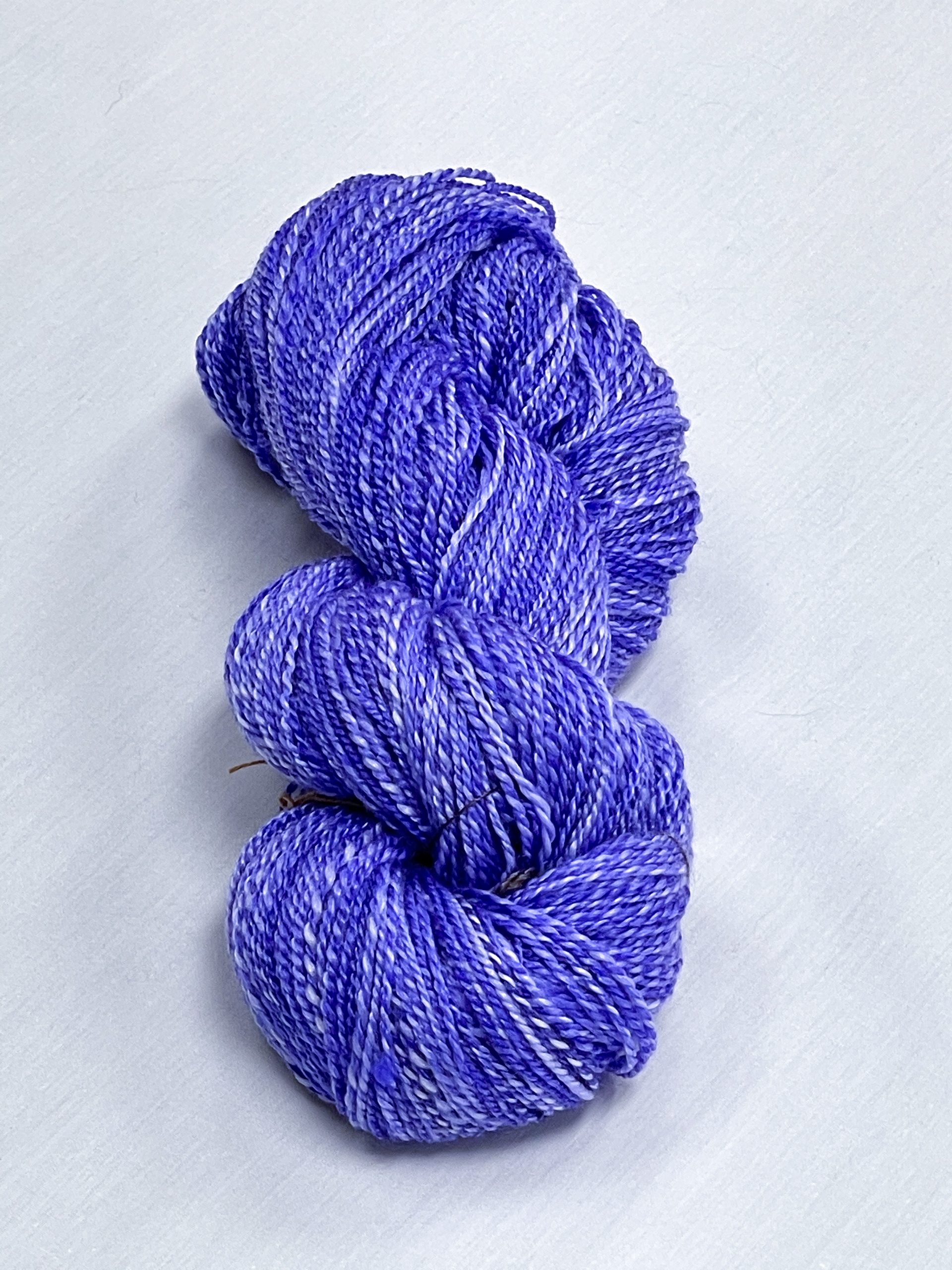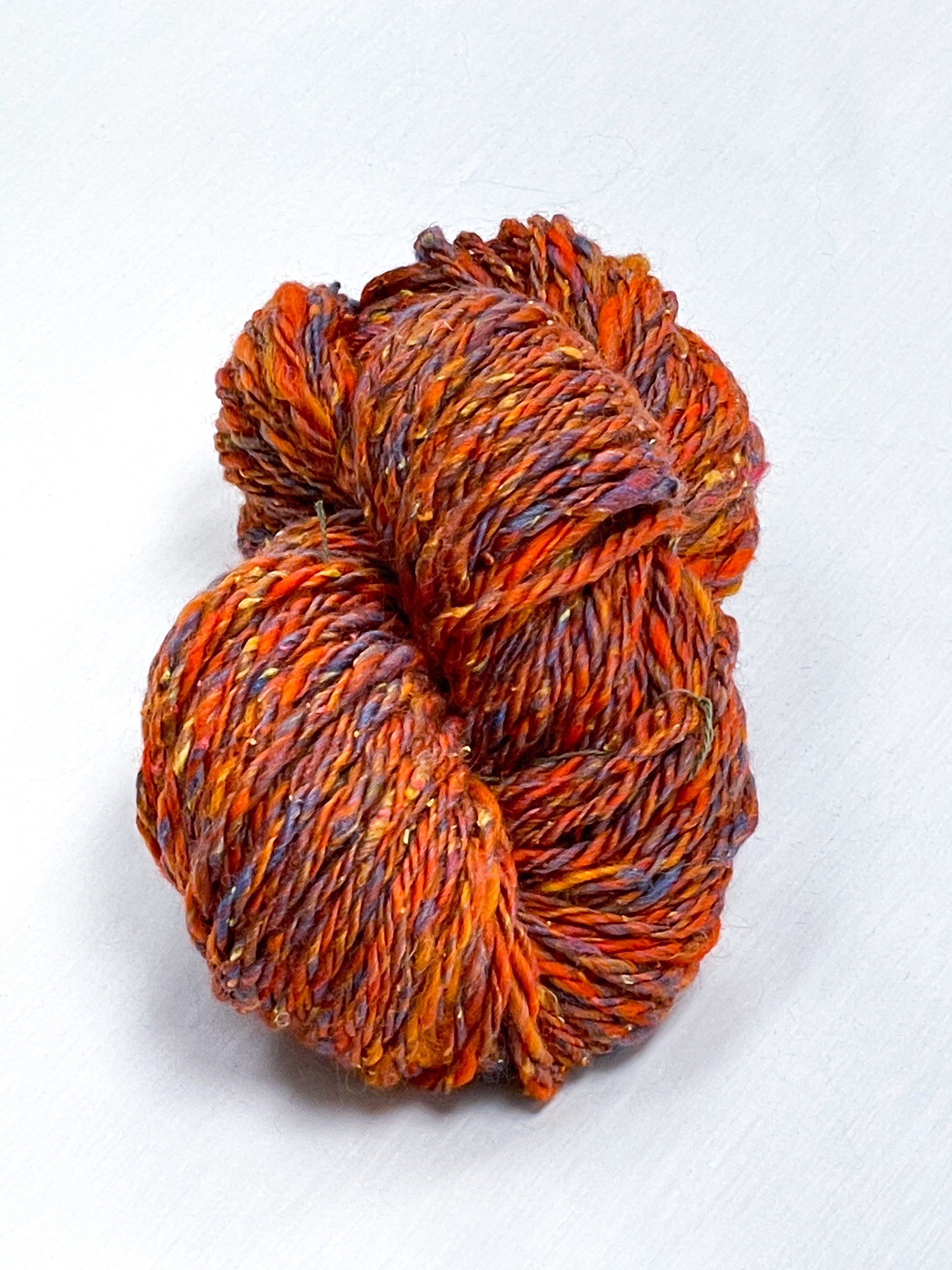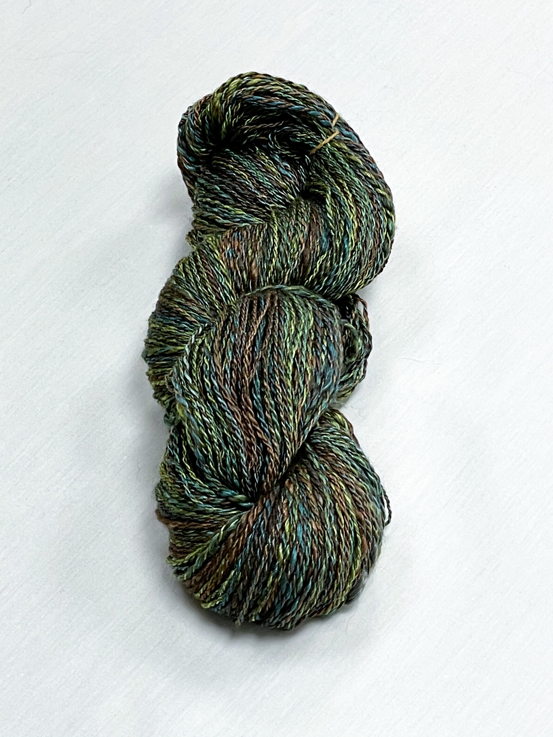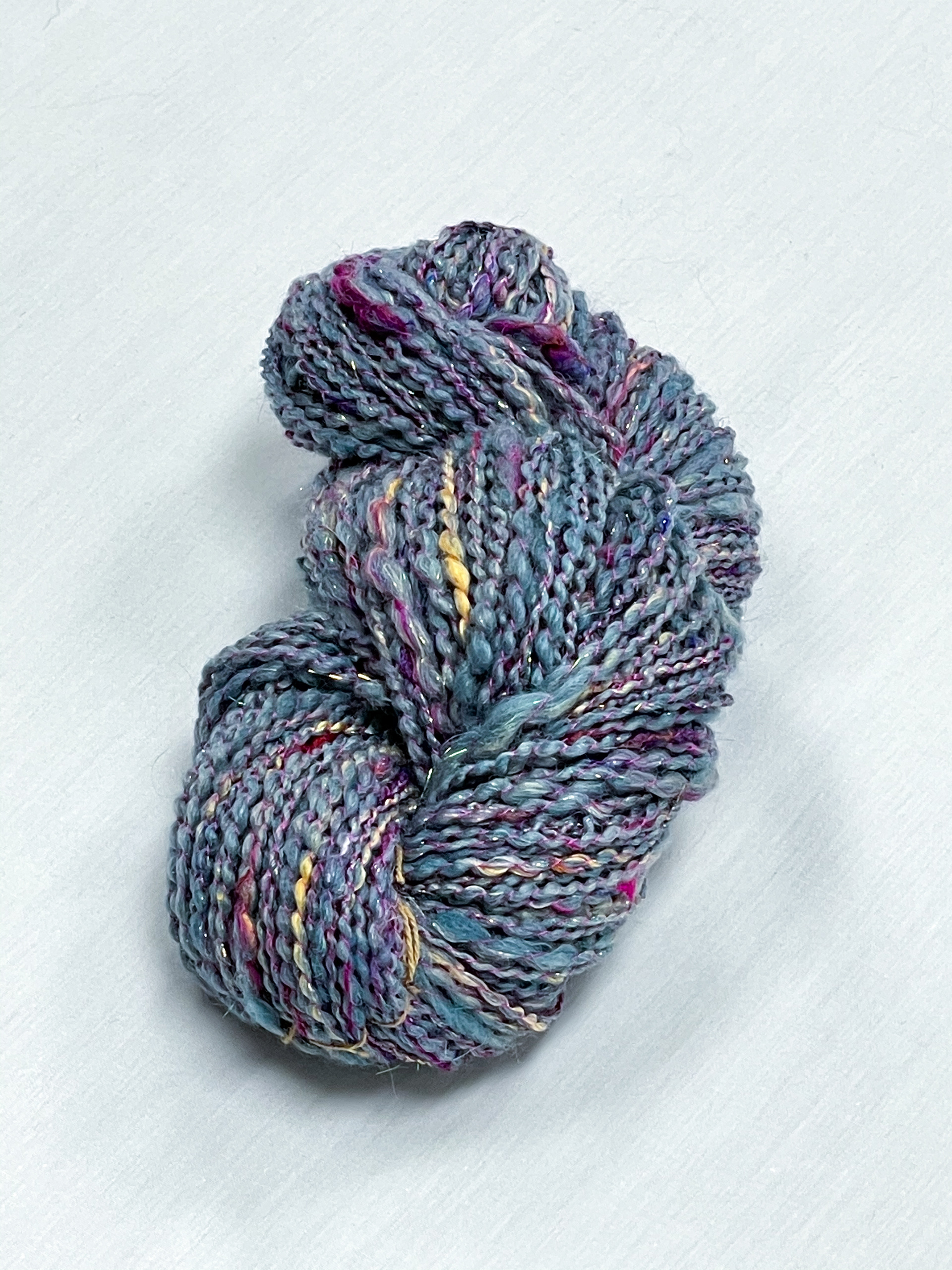 hand spun and dyed yarn with a variety of wools, bamboo, cottons, and metallic materials.