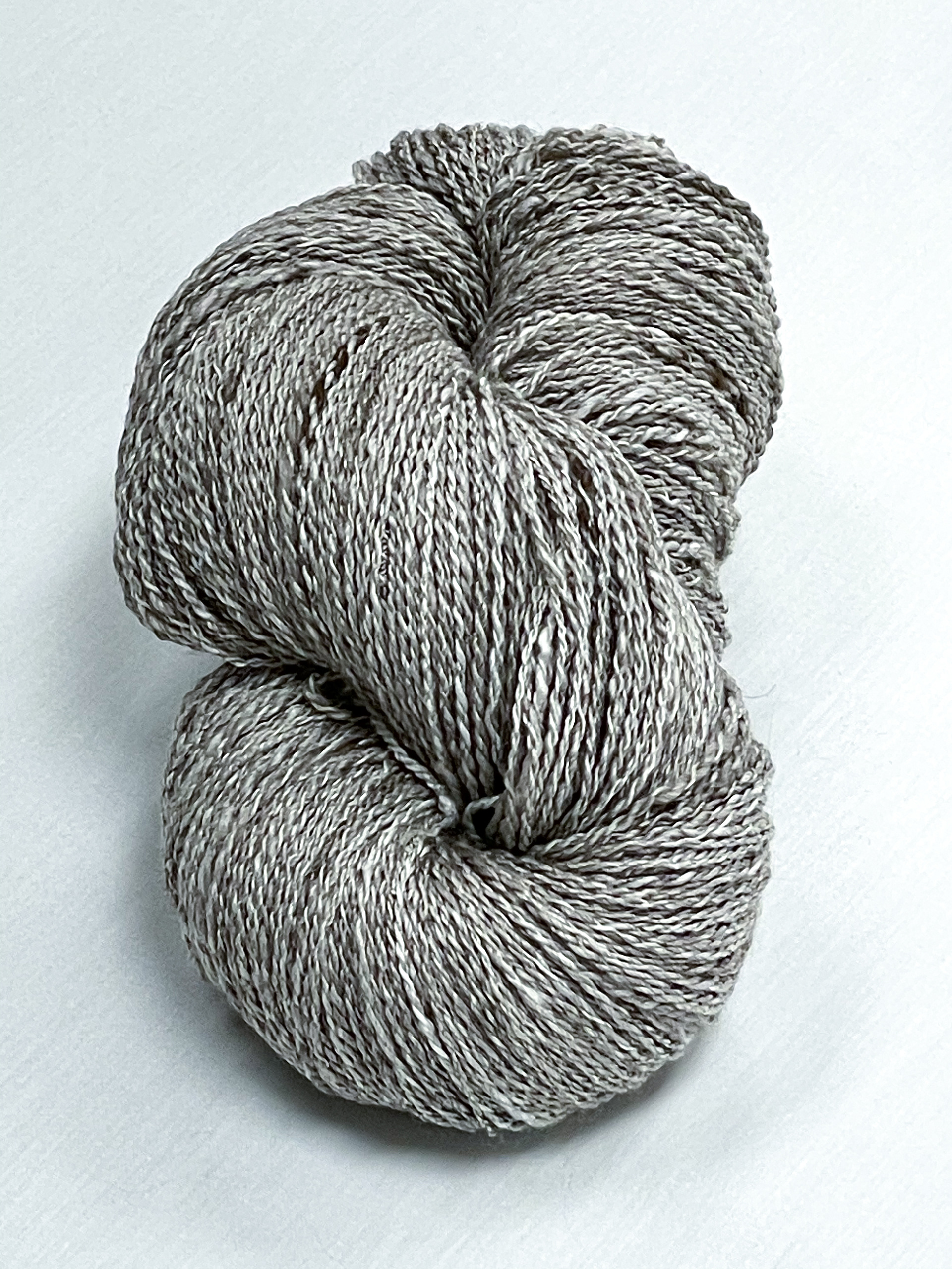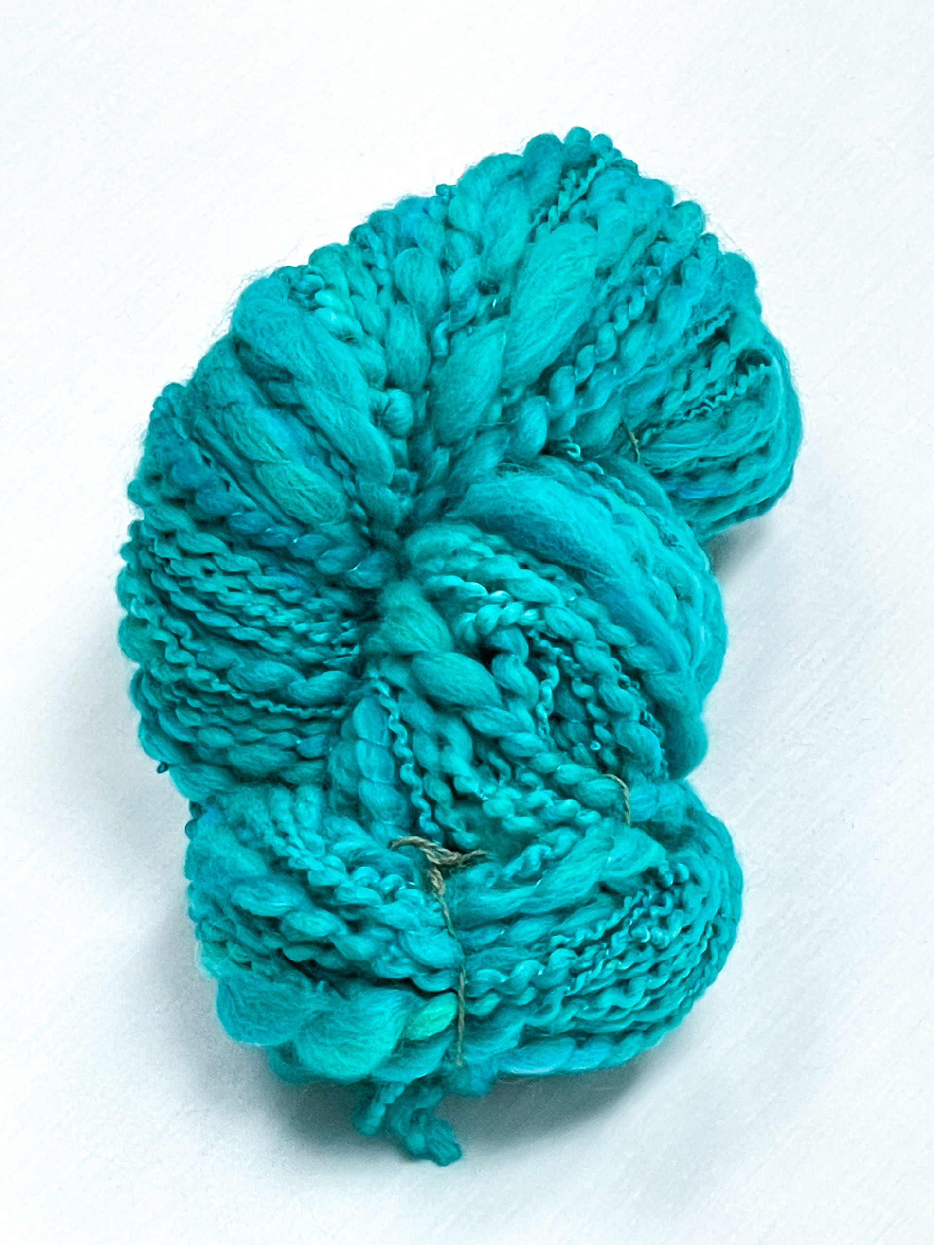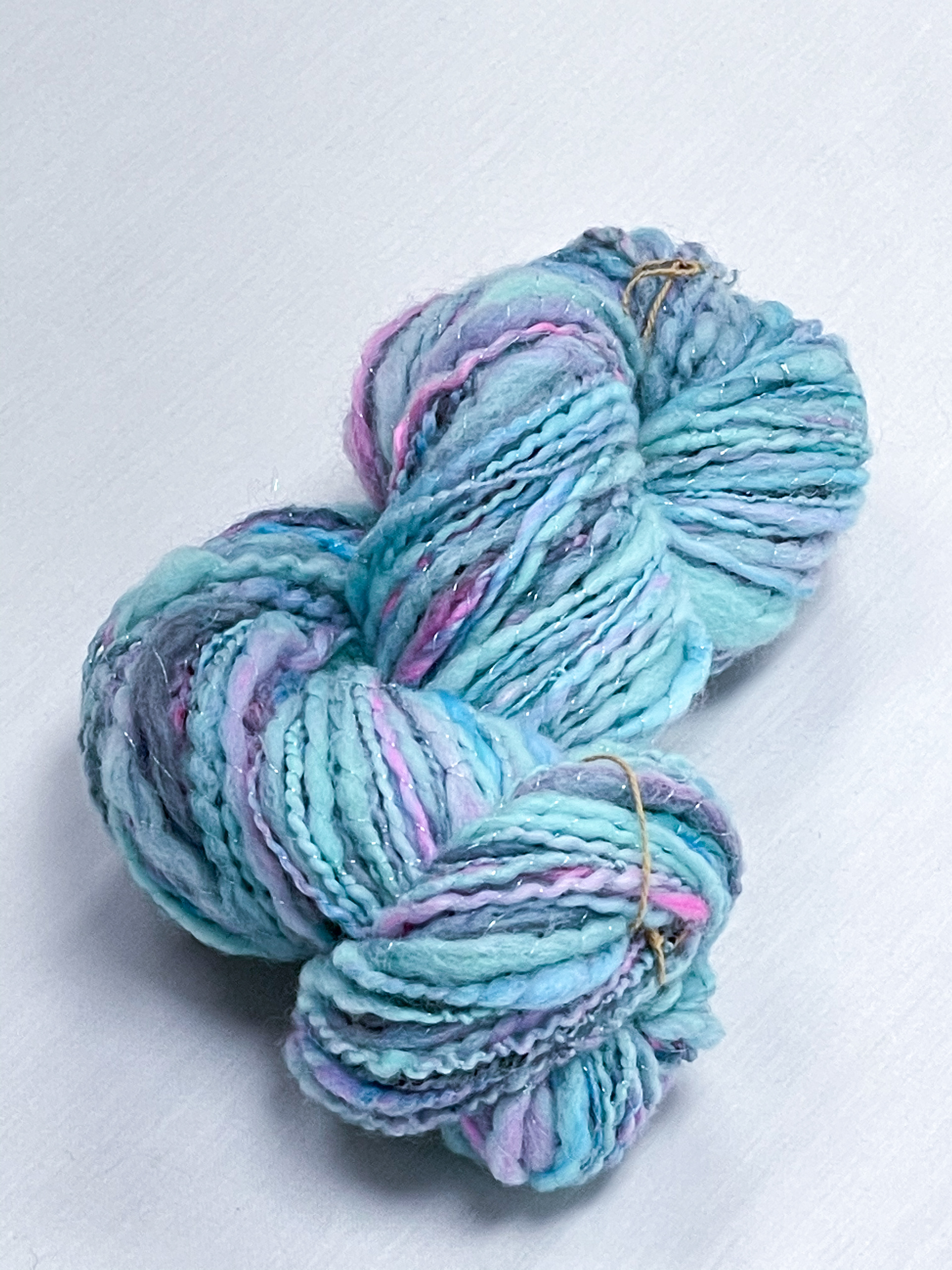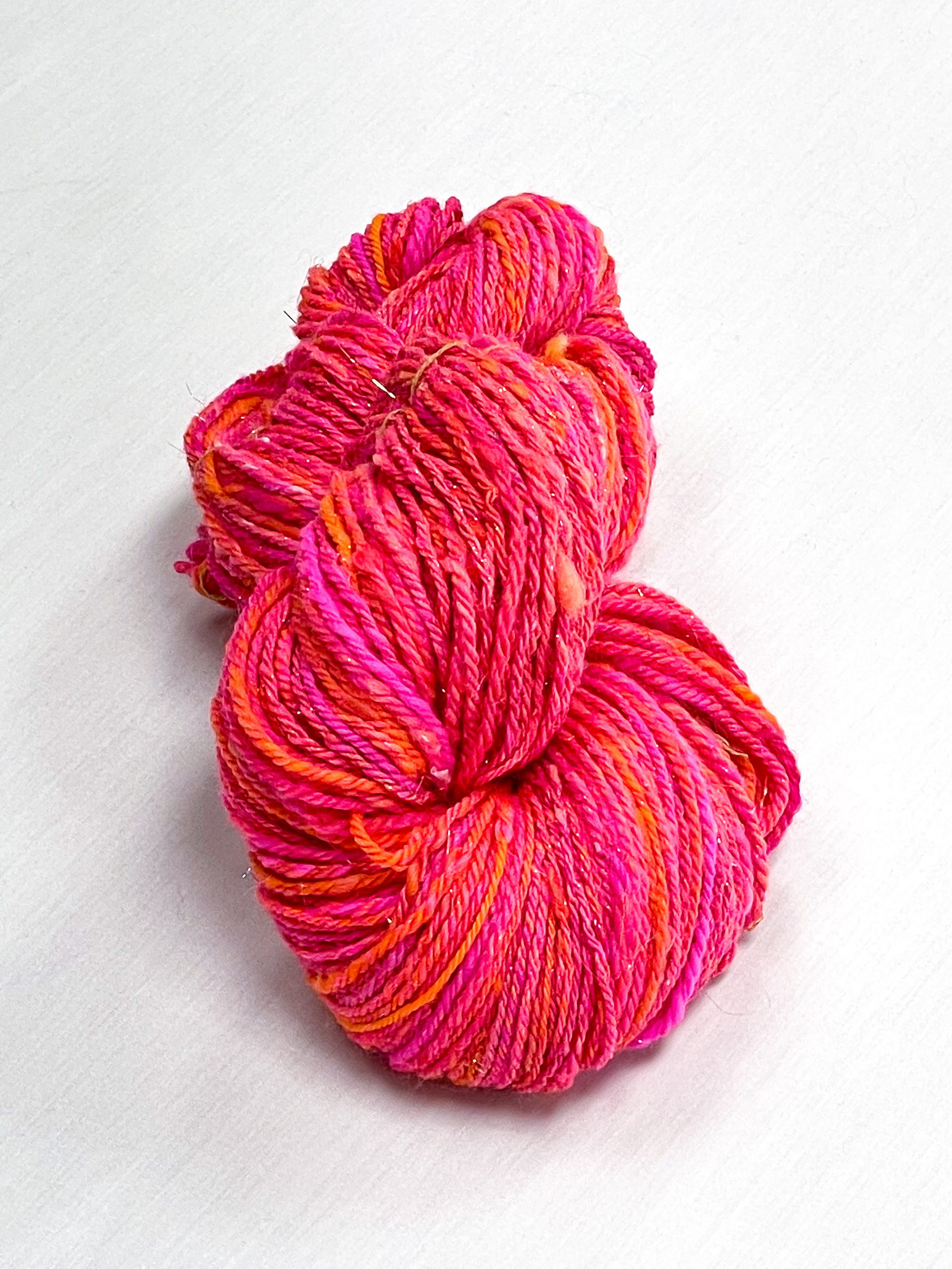 hand spun and dyed yarn with a variety of wools, bamboo, cottons, and metallic materials.